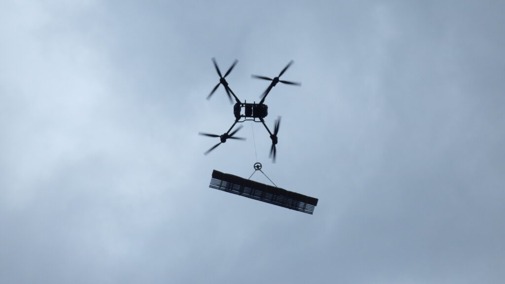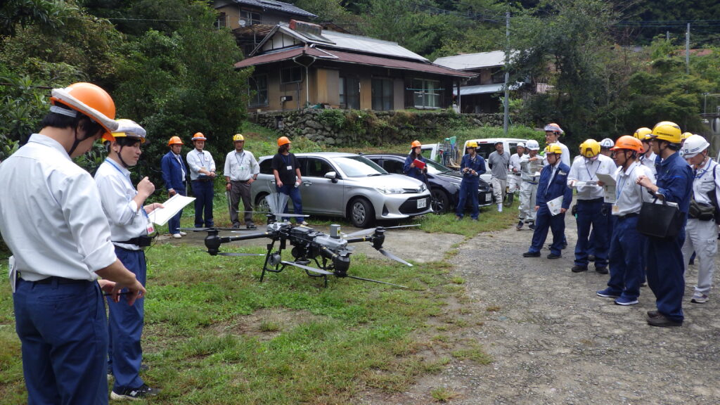 弊社の白川作業所では、法枠工資材の運搬手段として大型ドローンを活用した資材運搬を実施し、従来の人力・重機運搬に比べて大幅な省力化を図っています。