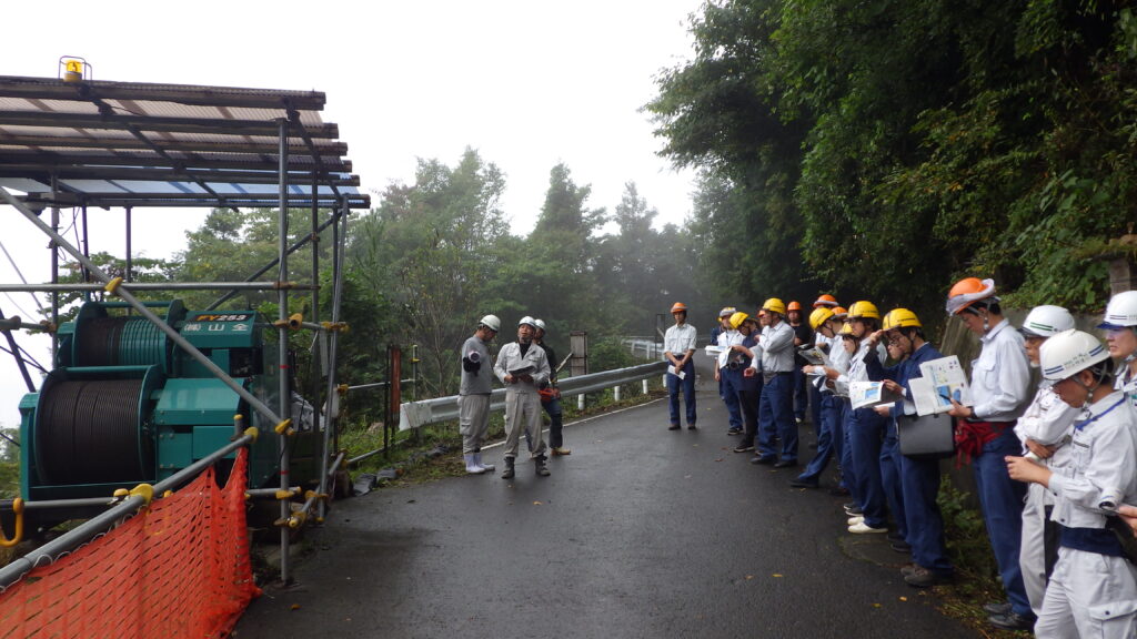 吉野川上流地区民有林直轄治山事業の現場において、安全性の確保、省力化および作業の効率化を目的とした資材運搬工法の現場見学会を実施いたしました。