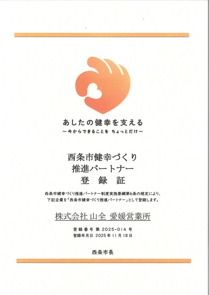 健幸づくり推進パートナーに登録されました。 2025/12/16 このたび、弊社は「西条市健幸づくり推進パートナー」として登録されました。 本制度は、西条市と企業・団体が連携し、市民の健康づくり(健幸づくり)を推進することを目的とした制度です。健康づくりに積極的に取り組む事業所等を市が「推進パートナー」として登録し、その活動をPR・支援することで、地域全体に健幸づくりの取り組みを広げていきます。 一覧へ戻る
