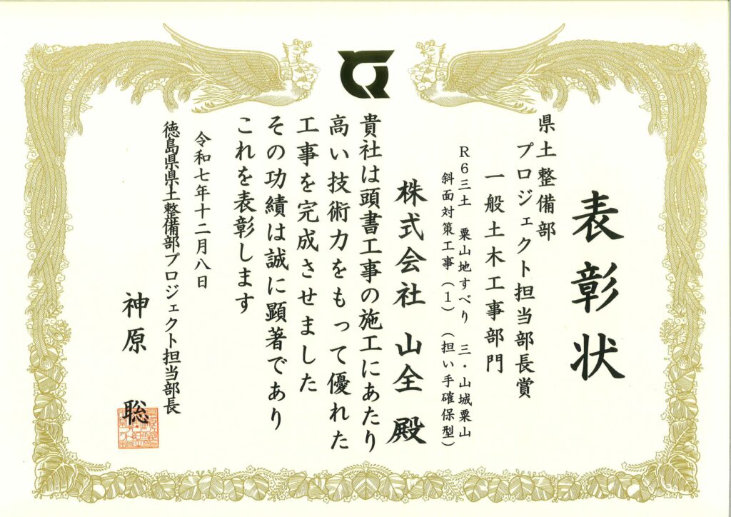徳島県 県土整備部 プロジェクト担当部長賞 2025/12/24 2025年度徳島県優良工事表彰があり、弊社が施工させて頂きました「R6三土 粟山地すべり 三・山城粟山 斜面対策工事(1) (担い手確保型)」が優良工事として、徳島県土整備部プロジェクト担当部長より表彰されました。 一覧へ戻る