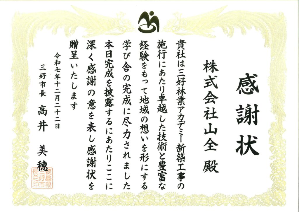 三好林業アカデミー新校舎 完成記念式典 2026/01/14 弊社が施工させて頂きました「三好林業アカデミー新校舎」において、完成記念式典が開催されました。 本新学舎の建設に尽力されたことに対し、三好市長より感謝状を贈呈いただきました。 一覧へ戻る