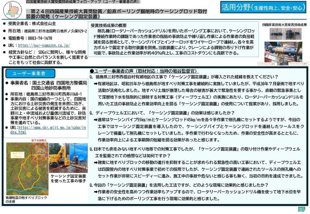 第24回四国産業技術大賞 奨励賞を受賞しました「鉛直ボーリング掘削時のケーシングロッド取付装置の開発」について、実際の現場での活用に至った経緯や使用後の感想が、四国産業・技術振興センターの「ユーザー事業者の声」として掲載されています。