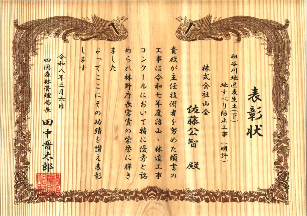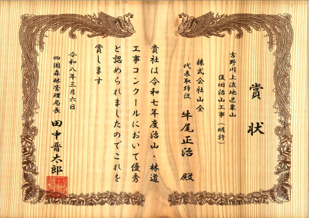 令和8年3月6日、四国森林管理局において、令和7度 治山・林道工事コンクールの表彰式が行われ、弊社が施工させて頂きました「吉野川上流地区 粟山復旧治山工事(明許)」が優良工事として、四国森林管理局長様より表彰されました。