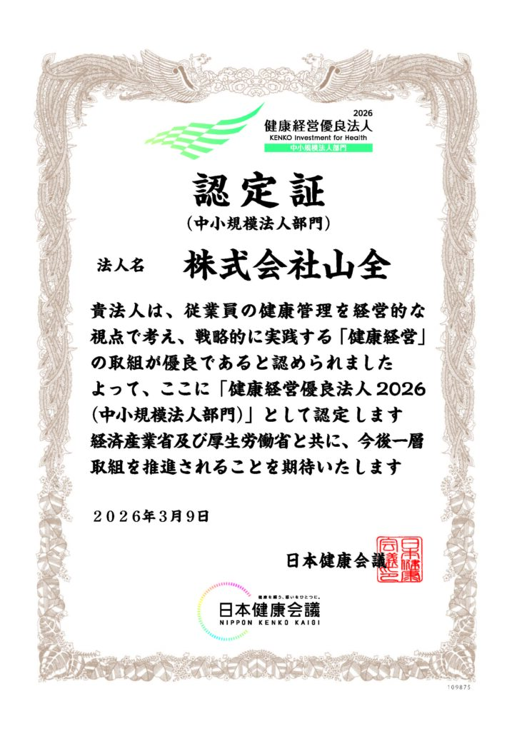 健康経営優良法人2026に認定されました。 2026/04/06 経済産業省および日本健康会議が選定する「健康経営優良法人2026(中小規模法人部門)」に認定されました。 健康経営優良法人認定制度は、企業や団体が従業員の健康管理を重要な経営課題と位置づけ、戦略的に取り組んでいる姿勢を評価し、認定する制度です。 当社では、従業員一人ひとりの心身の健康が企業の持続的な成長につながると考え、今後も健康づくりの推進に積極的に取り組んでまいります。 一覧へ戻る