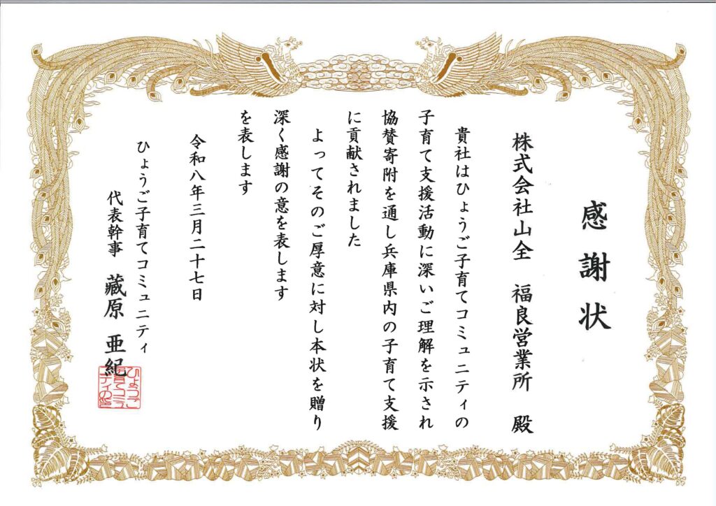 このたび、ひょうご子育てコミュニティ様より、弊社の取り組みに対し感謝状をいただきました。